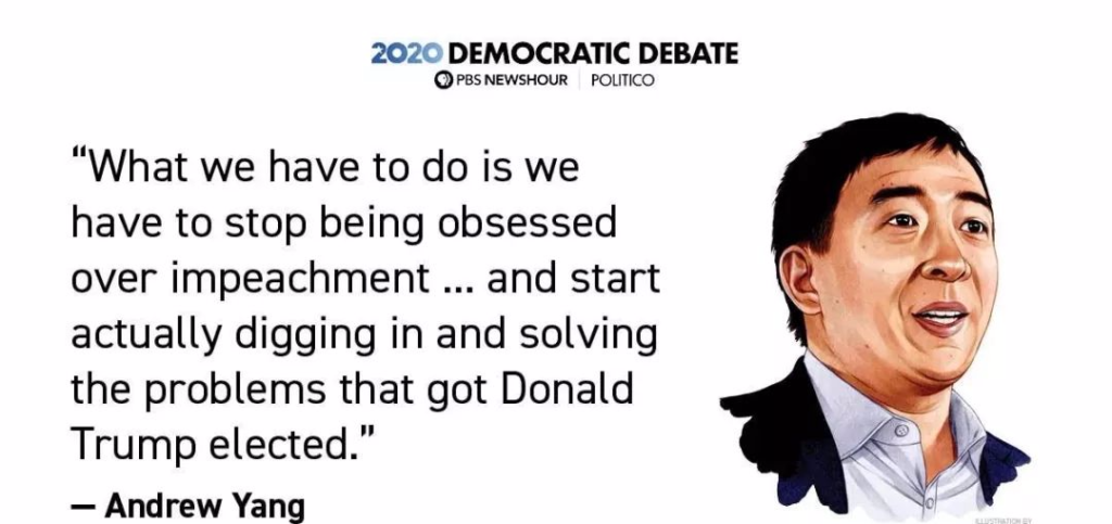 跟前面几次的辩论一样,杨没有攻击在场的人,展现了一种积极、包容的言行一致,相反他称赞了沃伦等人,甚至给不在辩论台的其他候选人、特别是有色人种议员打气;在人工智能、核能利用、社交媒体信息操纵等方面,他给出了与众不同的见地并呼吁脚踏实地解决实际问题。这都是一种具有前瞻性、实践性的领导力的体现。例如涉及弹劾问题,他再次指出应该把我们的注意力放在如何解决真正该解决的问题,而有色人种的代表性跟经济基础息息相关。