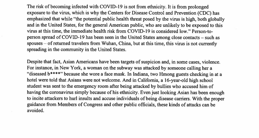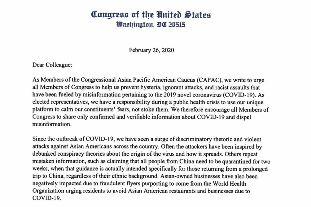 作为国会亚太裔美国核心小组(CAPAC)的成员,我们写信敦促所有国会议员帮助我们,预防因2019年新型冠状病毒(COVID-19)的不实信息而引起的偏执思维、无知的攻击和种族主义侵犯。作为民选代表,在公共卫生危机期间,我们有责任使用我们独特的平台来消弭选民的恐惧,而不是火上浇油。因此,我们鼓励所有国会议员仅分享有关COVID-19的已确认和可核实的信息,并抵制不实资讯。