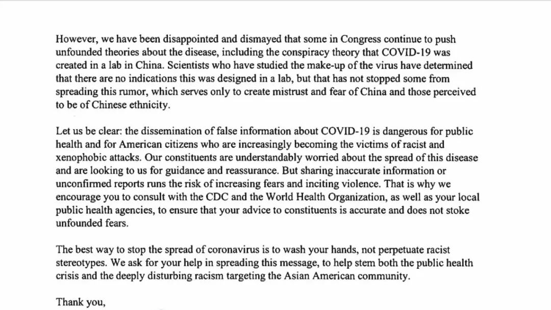 但是,我们感到失望和失望的是,国会中的一些人继续推销关于这种疾病的毫无根据的理论,包括在中国的实验室中制造COVID-19的阴谋论。研究其成分的科学家已经确定,没有迹象表明它是在实验室设计的,但是这并没有阻止某些人散布这种谣言,那样只会造成对中国、以及看起来像华裔的那些人的不信任和恐惧感。