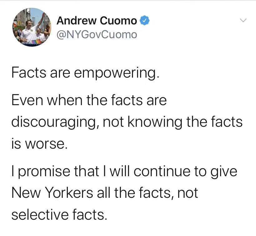 我承诺我将给纽约州的每一个人所有的真相,而不是有选择性的真相。 ”
