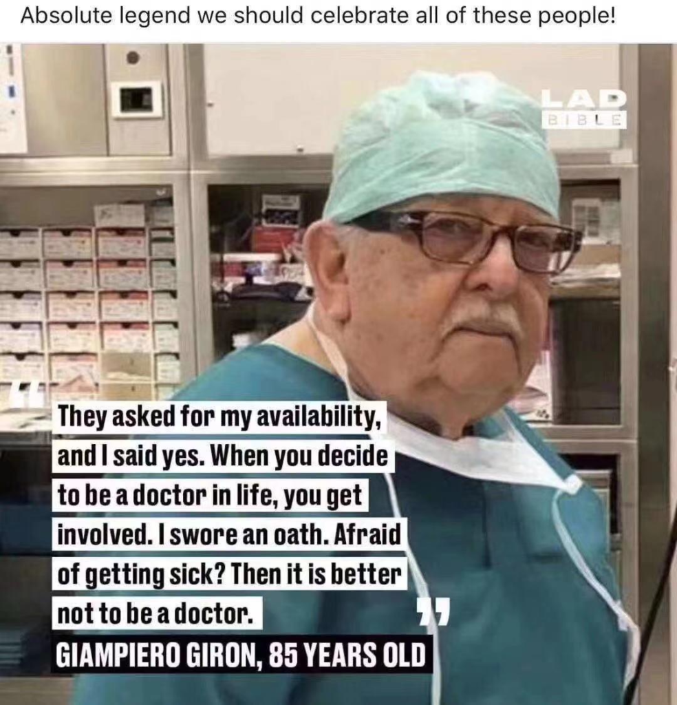 在意大利,85岁的医生重新上岗!1985年,麻醉师Giampiero Giron参与了在意大利进行了首次心脏移植手术。35年后,他再次出征,为正面临冠状病毒大流行的医生们提供支持。先生,你太棒了!