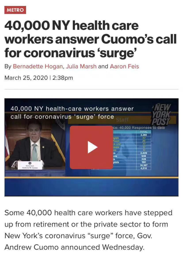 我们能够看见的是,40000纽约人,已经相应州长的呼唤,加入了抗疫的人群!