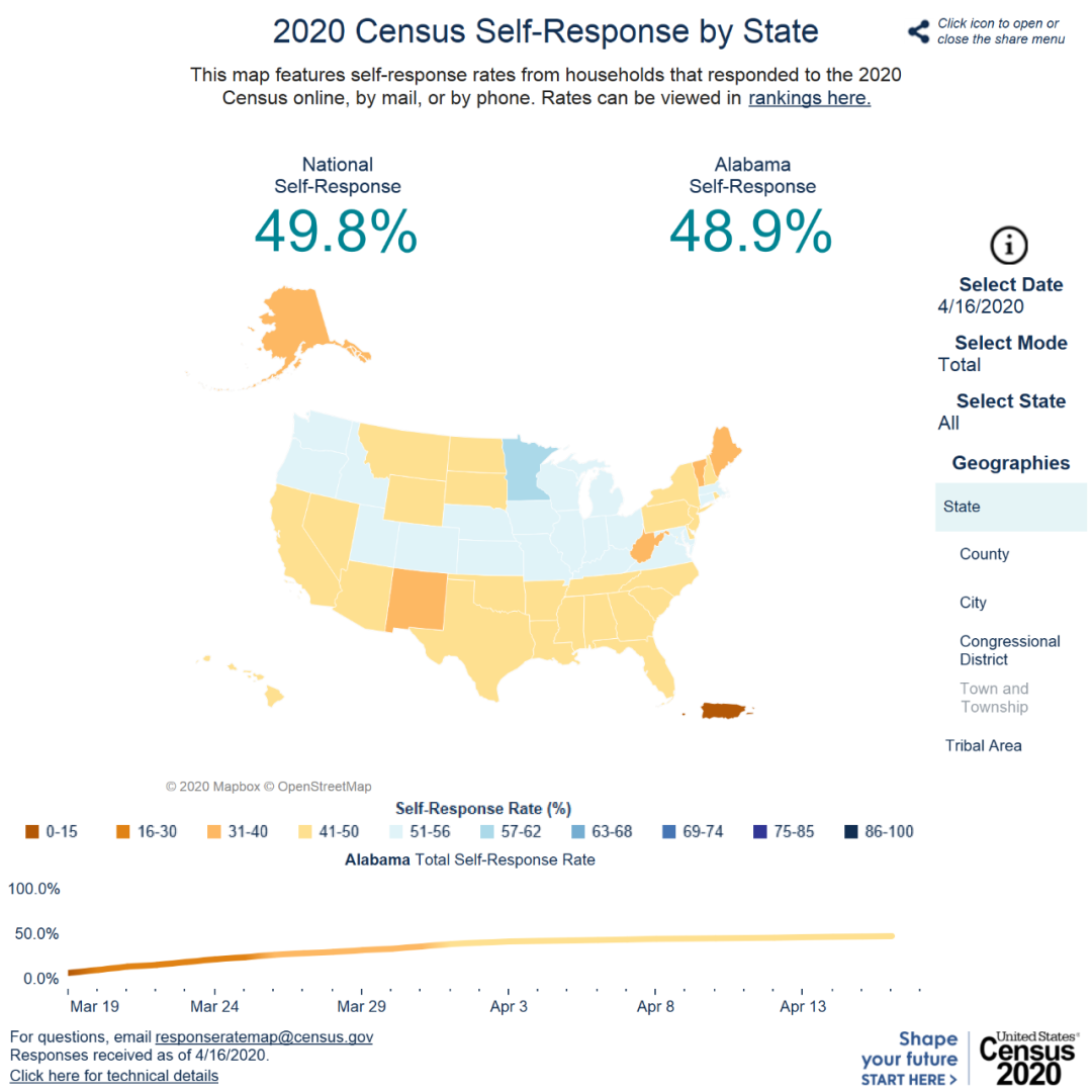历史上第一次,人口普查局发布每日更新的自主回答率。大家可以利用这个最新的数据工具鼓励亲朋好友和社区群众来积极回答人口普查,确保他们都可以算上。请点击下面的链接,查看自己的社区与其他地区的对比,不仅信息丰富,还很有趣! 动态地图链接:https://2020census.gov/en/response-rates.html