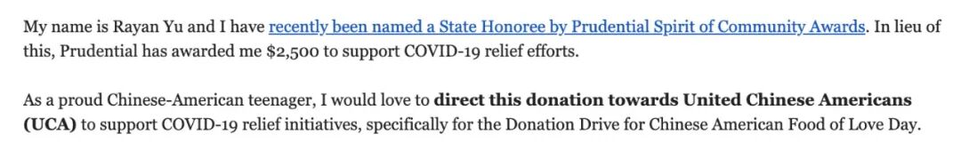 拿到奖金后,激动之余,Rayan Yu却立刻想到了自己的初衷:帮助那些需要帮助的人。他写了一封信给UCA,信中说自己是一名自豪的华裔美国青少年,愿意把获得全部2500美元奖金捐献给UCA,以支持华裔美国人的COVID-19抗疫活动,特别指定是用在刚刚启动的“华人爱心中餐日”活动中。