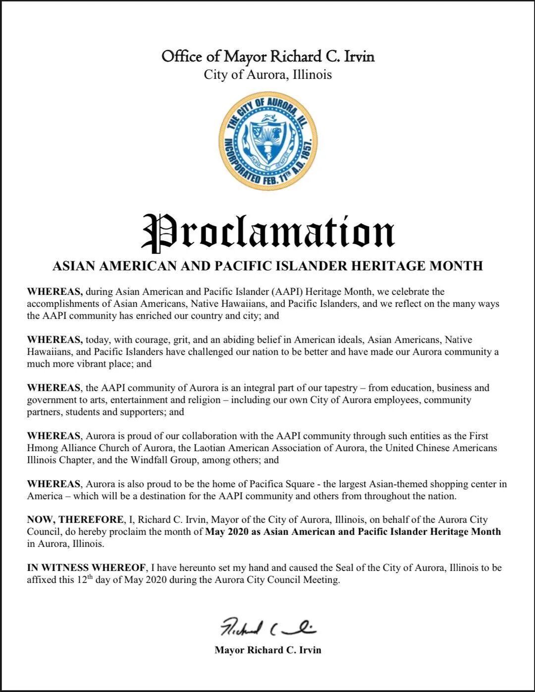 伊州Aurora市长办公室Richard C. Irvin 关于亚裔传统月的公告