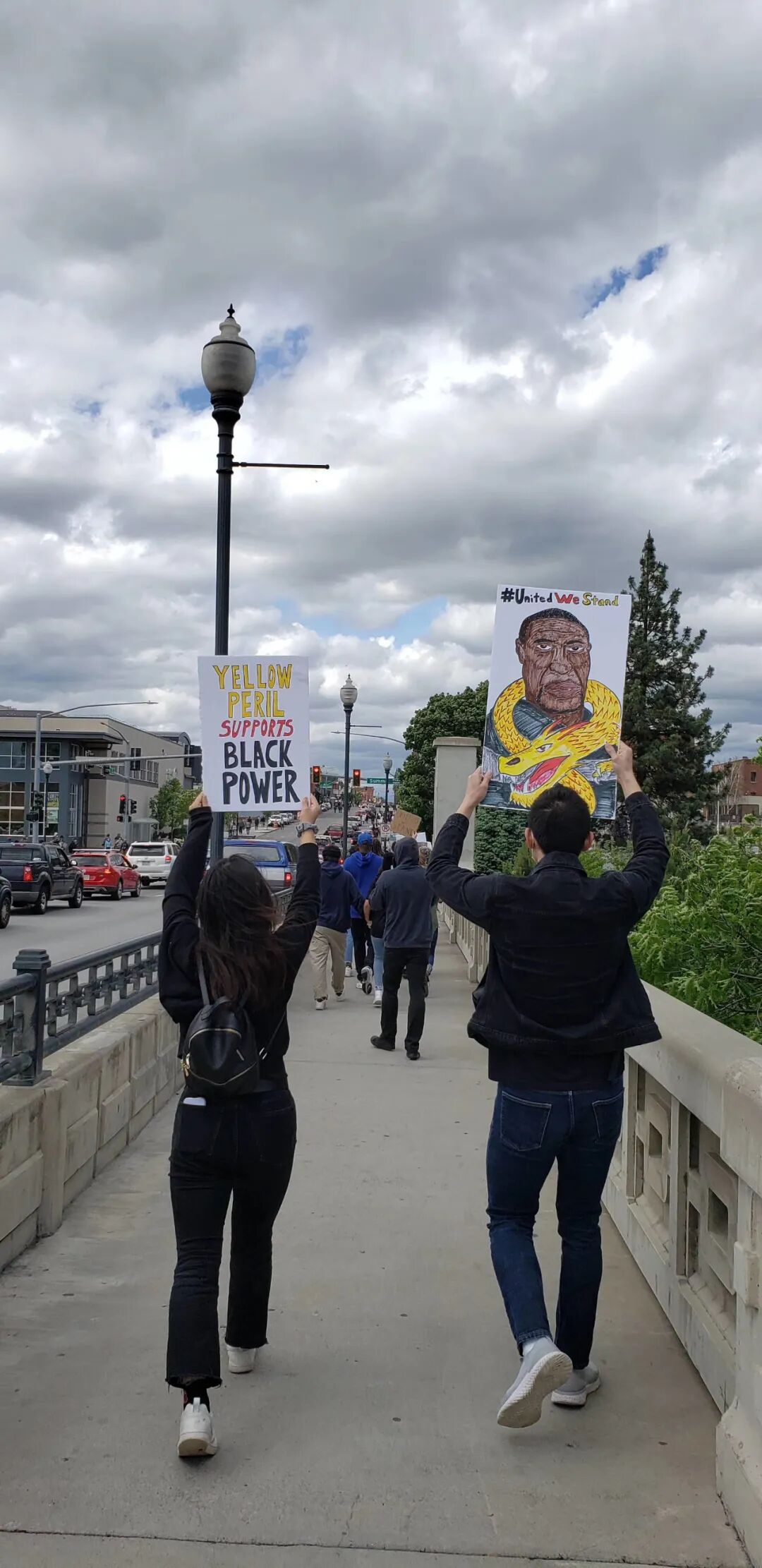 在这次全美的游行中,我们看到一些积极的、令人充满希望的画面:在遭受打砸抢的社区,人们自发清理打扫,并为受到损失的家庭和商业送上了数以千计的食物袋;在有的和平游行里,警方与示威者并肩、致敬甚至单膝下跪,甚至有游行者保护落单的警察免受暴徒袭击;包括华人在内的不同族裔面孔,都出现在各地的支援队伍里,共同呼唤对于现有体制、警察文化的改革。有人设计了“黄祸支持黑人民权”的图文标语,这也是关于少数族裔相互支持的理念。