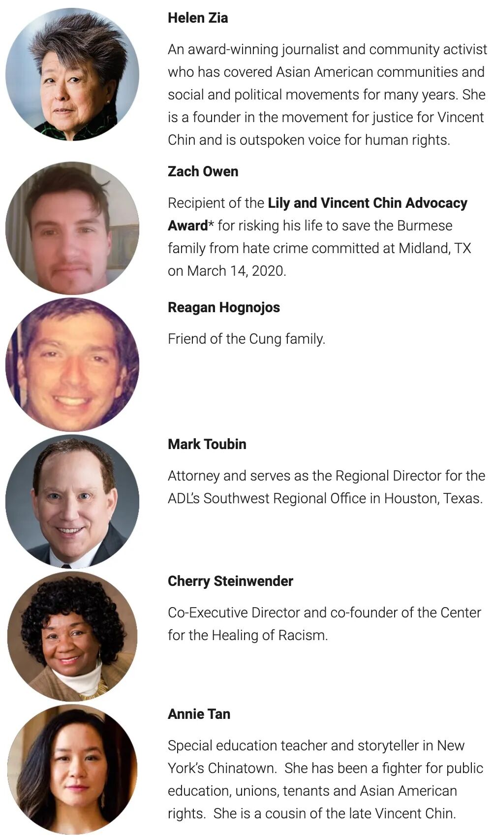 作为亲自参与Vincent Chin事件和“the Estate of the Chin family”的监护人的华裔女作家Helen Zia,授权AASFH以“Lily and Vincent Chin Advocacy Award”为命名,由AASFH和UCA颁奖给最近在德州Midland的Hate Crime中救助了亚裔家庭的两个英雄。他们是当时在现场的Zach Owen和边境管理局的Bernie Ramirez。Zach 因为与暴徒格斗,大腿和手部严重受伤,至今仍无法正常工作。