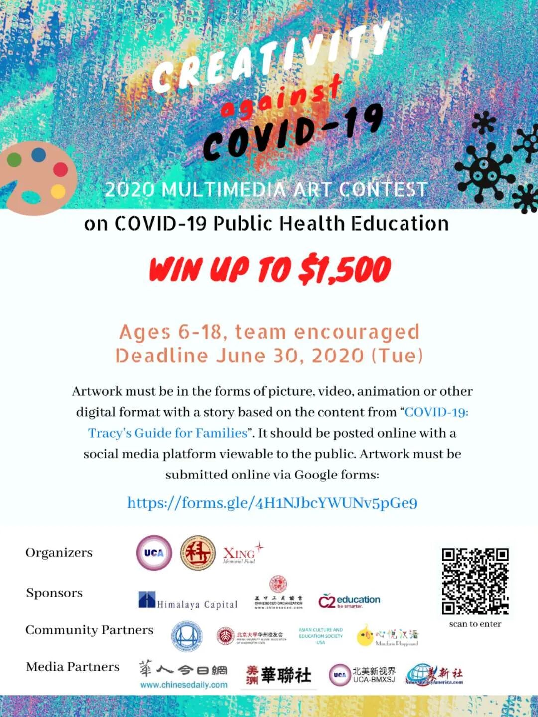 “Creativity against COVID-19” 青少年创艺大赛对年龄在6至18岁之间的所有美国K-12学生开放,组织者特别鼓励团队参赛。参赛作品须采用图片、视频、动画或其他多媒体形式,内容故事须基于UCA新冠肺炎公共卫生教育项目“Tracy姐姐新冠肺炎家庭防护指南”(https://tracysguide.blogspot.com/)中内容。参赛者须将作品在网上或社交媒体上发表并对公众开放。参与者应在2020年6月30日(星期二)之前将参赛作品的URL通过以下网址在线提交: