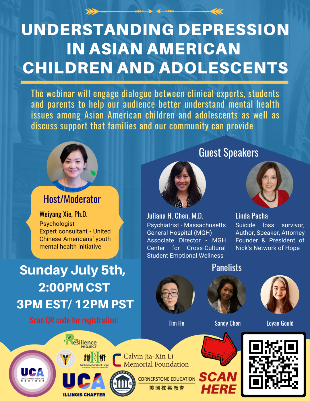 下周日07/05美国中部时间下午2点(东部时间3点),我们特为您邀请了心理专家来做专业讲解,同时我们也特邀几位家长和学生代表,和大家分享他们的真实故事,并和大家做面对面的交谈。【阅读:中文版内容在这里】