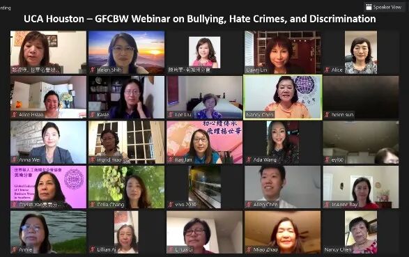 7月28日,UCA Houston 与世界华人工商妇女企管协会美南分会(GFCBW in Southern USA) 再度举办了一场特别针对种族歧视和仇恨暴力的网上研讨会【2】。讲座YouTube 链接见本文末的参考一栏。GFCBW的成员主要来自台湾,美国西南区主席Nancy Chen和主持Dawn Lin 女士介绍了在疫情中的救援公益,主讲人之一的萧老师分享了为孩子们和家庭处理受到欺负Bullying的经验,为来自大陆和台湾的朋友们做好非常时期之下华裔需要做好的心理准备。