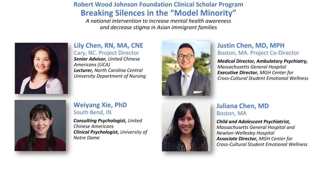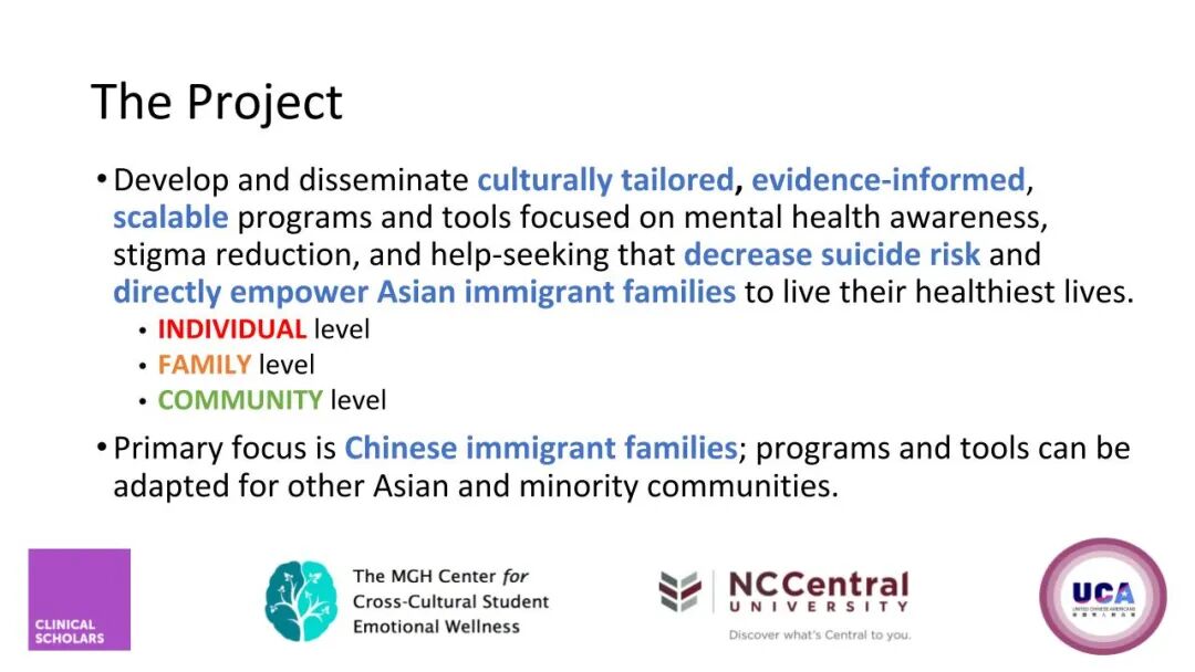 我们的项目是“打破模范少数民族的沉默”:一项旨在提高亚裔移民家庭的心理健康意识、减少对其污名化的全国性的干预项目”,解决华人移民家庭的心理健康和自杀问题。
