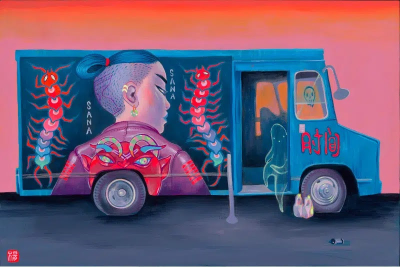 洛杉矶华裔艺术家Lauren YS,以色彩鲜艳的迷幻风格画作探索酷儿身份与种族认同议题,为BIPOC和LGBTQ+群体发声。其作品融合中国传统文化元素、南加州街头艺术技法,以及文学、插画和动画等多重影响。YS表示,“我的作品常涉及酷儿和混血亚裔身份的多个层面,探讨自我认同和包容性问题。角色常以半生物形态出现,或从中国古代神话演变而来。”她的代表作《甲骨》(Oracle Bone)描绘一个透过面纱窥视的角色,探讨混血身份的焦虑感。画中人物手指刻有甲骨文,象征血统真实性与身份认同的复杂性。作品《Sana Sana》记录了她2023年在墨西哥城绘制的卡车壁画,原作已被涂鸦覆盖,她通过绘画重新诠释,向城市景观的更新、破坏和留下的伤痕致敬。标题源自当地短语“治愈、治愈”,是人们抚慰伤痛时的常用语。YS的作品传递着温暖信息:在追寻身份、尊严和爱的过程中,没有人孤独前行。